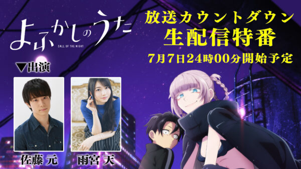 TVアニメ『よふかしのうた』の放送カウントダウン生配信特番を、放送日でもある7月7日24時(8日0時)に実施することが決定しました!出演は、夜守コウ役の佐藤 元さんと七草ナズナ役の雨宮 天さん。